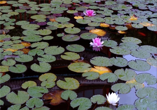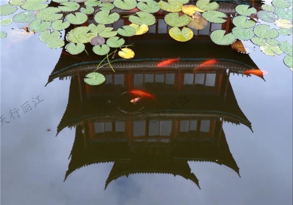 往前走幾步,便被開滿睡蓮的心湖所吸引。恰逢秋季,湖面上青蓮盛開,湖中魚戲蓮葉,泛起陣陣漣漪,古樸的萬古樓倒映湖中,美得像一幅山水畫。