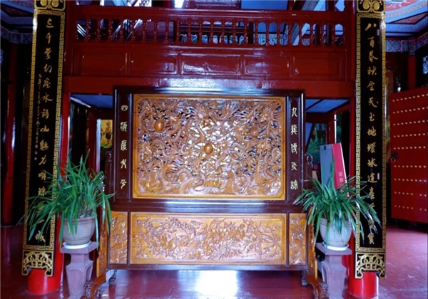 樓頂藻井蟠龍張嘴形態(tài),反映龍能吐水傳說,寓意有水克火消災(zāi)