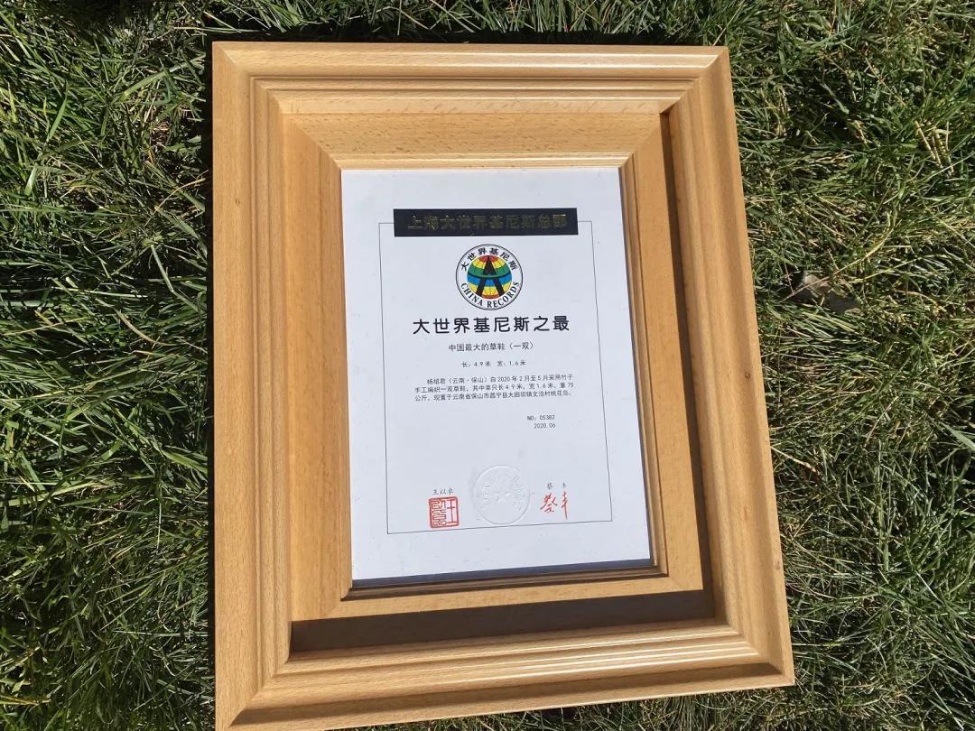 2020年,楊紹君來到麗江打工,來的時候還特意帶了10多雙在老家制作的草鞋。穿梭于束河古鎮(zhèn)的石板路上,他和他穿著的草鞋受到很多游客的關注,因此他萌生了傳承和發(fā)揚草鞋編織文化的想法,于是辭掉工作回到老家。在老家保山,他做了一雙長4.9米,寬1.6米,重75公斤的大草鞋,獲得了大世界基尼斯之最。