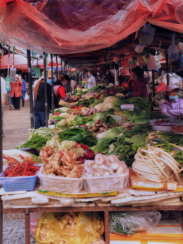 “南腔北調(diào)”的賣菜攤,麗江的菜市場,十個賣菜商販中,怕是會有七八種口音。“嬢嬢,這個青菜咋個賣?”“兩塊一把咯!阿妹~”