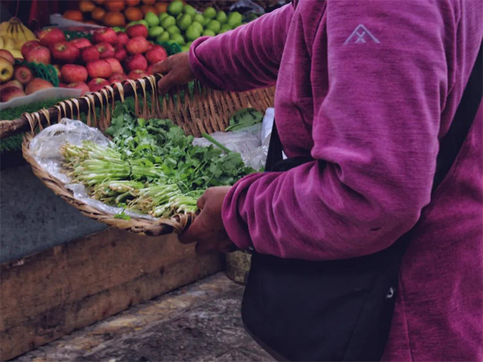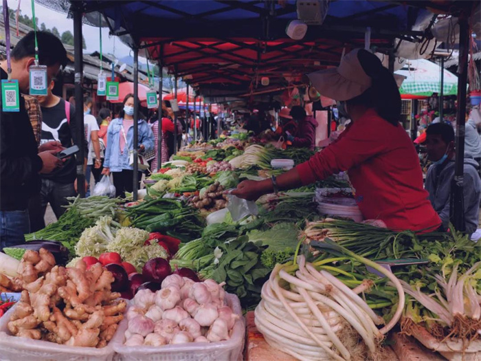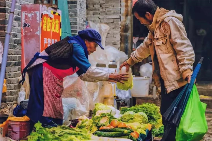 在市場里,時常會遇見上了年紀(jì)的納西阿奶和新潮時尚的游客擦肩而過;有依然使用老式桿秤,只收現(xiàn)金的老奶奶;卻隨處可見電子秤和微信收款二維碼;有納西人家后院自種的青菜小蔥和瓜果,也有經(jīng)過改良的大棚優(yōu)質(zhì)茄子蘿卜和白菜……