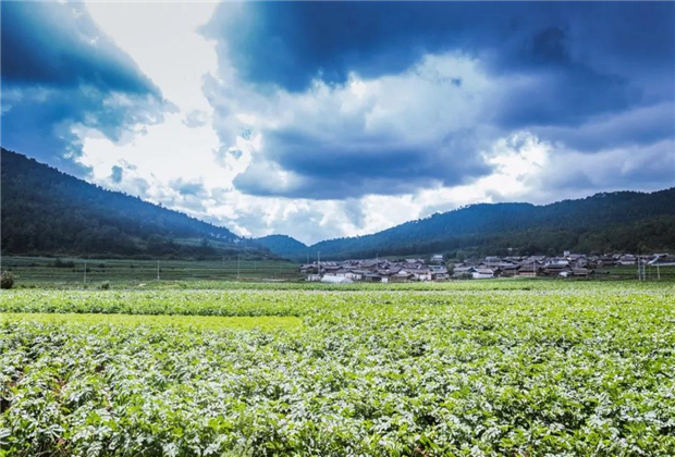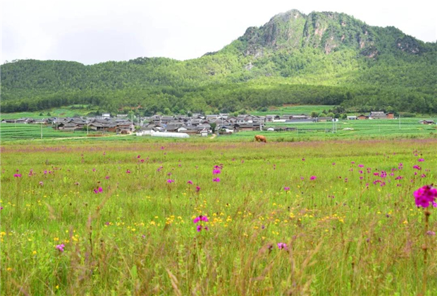 前有雞冠山,后有文筆峰,四周被大大小小的群山包圍著,一路柏油路暢通,洋芋花環(huán)繞村莊,清風(fēng)細(xì)雨滋養(yǎng)著他們,美得青翠欲滴,村莊煥發(fā)出青春活力……