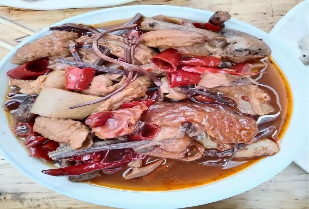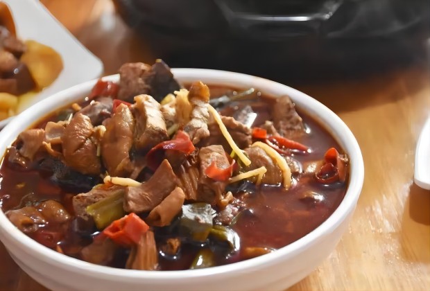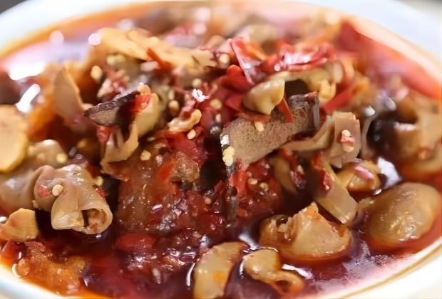 江邊辣制作方法十分獨(dú)特,需要先將干辣子切成約一寸長的小段,然后用菜籽油或核桃油煎成焦黃注入清水,按一定比例放入切成條形豆腐干、豬小腸、豬肚、生姜、花椒、草果、八角、醬油、精鹽等,先用大火煮上半小時,然后改用中火煮上2小時左右,再放入腌制吹泡的豬肝,煮上1小時左右便可起鍋。起鍋之前放入調(diào)料味精,一道色、香、味俱全的地方特色的“江邊辣”就做成了。