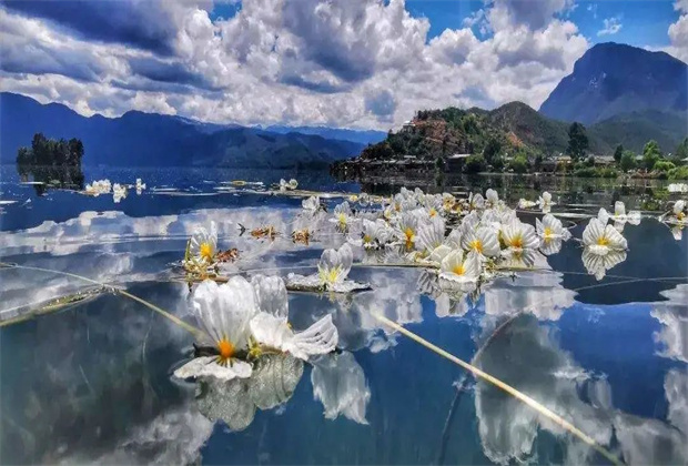 看湖中浪漫,“水性楊花”。澈藍(lán)的湖水中,靜靜搖曳著潔白的水藻花,簡(jiǎn)單質(zhì)樸,寧?kù)o素雅。