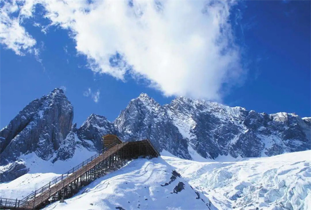 登上玉龍雪山,看雪與天齊勝景。在蔚藍(lán)的天幕襯托下,宛如一條玉龍凌空飛舞。