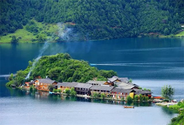 去瀘沽湖,坐一坐豬槽船。平靜的湖面上,游動(dòng)著朵朵白云,倒映著巍巍青山,突然被一葉小舟劃破山間的寂靜,變?yōu)橐环鲃?dòng)的山水畫。